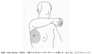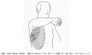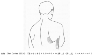 主訴:肩甲骨内側〜側胸部にかけての鋭い・しみるような痛み、肩を前に出すときの痛み、ときに肩甲骨の浮き上がり感。