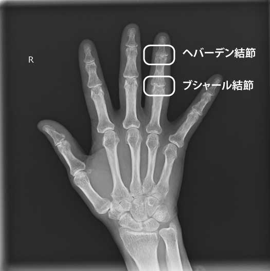 DIP関節の変形をヘバーデン結節、PIP関節の変形をブシャール結節と呼びます。
