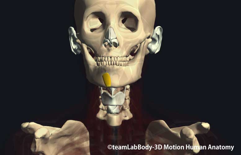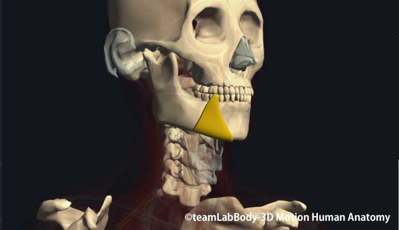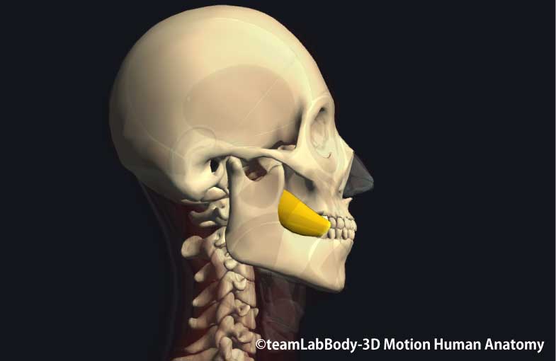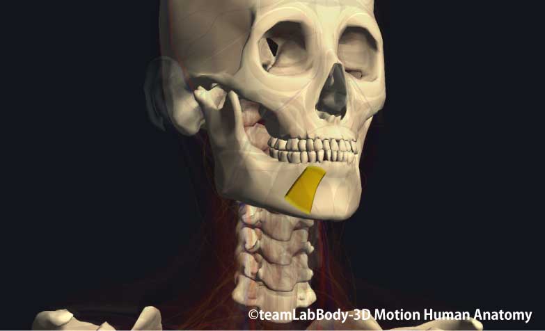 起始 下顎骨の前面(オトガイ孔と下顎骨正中の間)