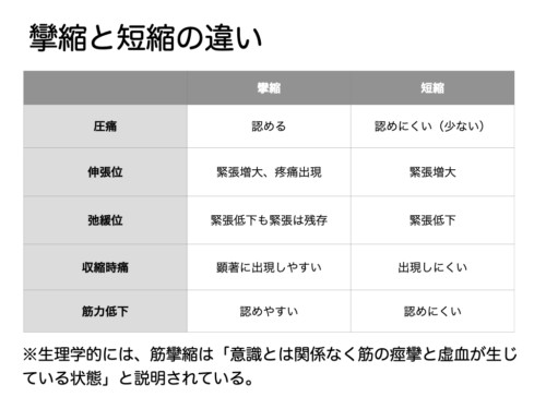 攣縮:筋束の一部に有痛性の緊張増大(虚血やトリガーポイント様)。一過性で、リラクゼーションや軽い収縮‐弛緩で即時に可動が戻ることが多い。