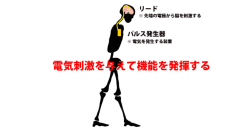 DBSとは、①電極、②リード、③刺激装置を手術で体内に埋め込んで、直接脳に刺激を与えることで症状を緩和させる方法です。