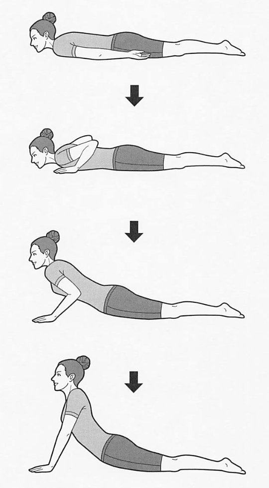 肩下に手、肘を伸ばして上体を持ち上げる。お尻と腰は脱力。1〜2秒保持→戻す×10。 -