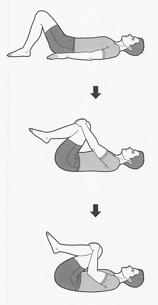 仰向け膝抱えや座位・立位前屈を、痛みが中央化・軽減する範囲で反復。