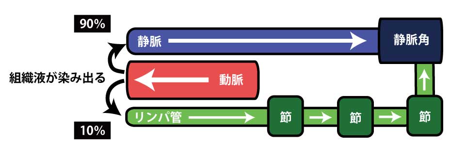 組織へしみ出た水分の大半は静脈へ、残りがリンパ管に取り込まれリンパ液として静脈角へ戻る。