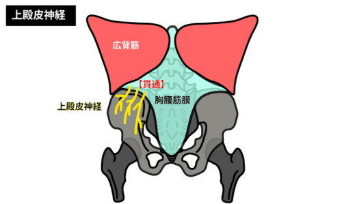 **上殿皮神経(SCN)は胸腰椎の後枝(主にT12–L3、個人差あり)**から出る皮神経で、腸骨稜(骨の縁)を越える所で胸腰筋膜と骨性トンネルを貫通して殿部上外側の皮膚感覚を支配します。