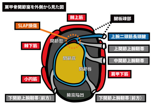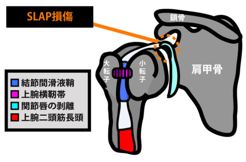 SLAP損傷(Superior Labrum Anterior to Posterior):長頭腱付着部の上方関節唇剥離。投球での「ピールバック」や牽引で発生。クリック感や深部痛。