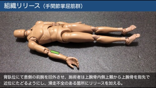 内側上顆→尺骨近位を指腹でトレースし、滑走不全部に持続圧+短距離ストロークでリリース。