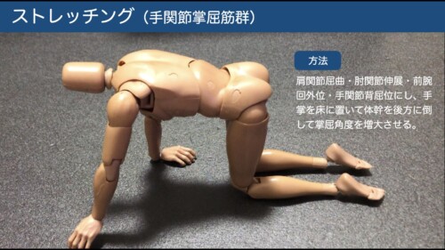 指屈筋を狙う日は指も伸展して実施。反動NG、痺れ・鋭痛は中止。