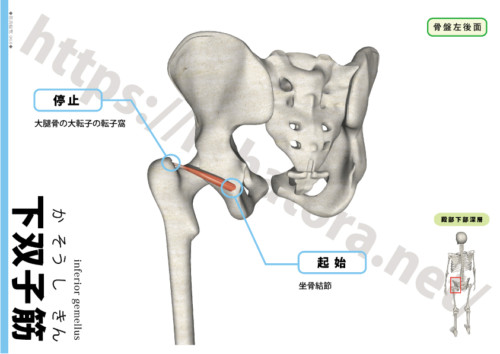 覚え方:上双子=坐骨棘、下双子=坐骨結節。いずれも内閉鎖筋腱に合流して転子窩へ。