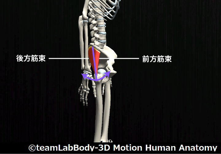 【解説】股関節の屈伸軸によって作用が分かれており、軸より後方を通る部分を後方筋束といい、股関節の伸展・外旋作用を有します。 |