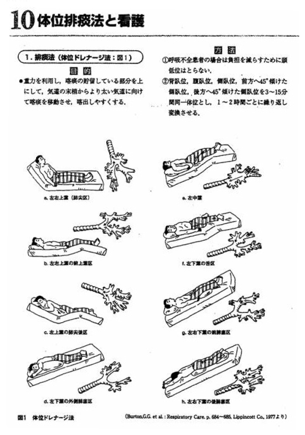 体位ドレナージとは、身体の向き(体位)を変えることで痰を排出(ドレナージ)する方法です。今から100年以上前にエワルトによって報告されました。