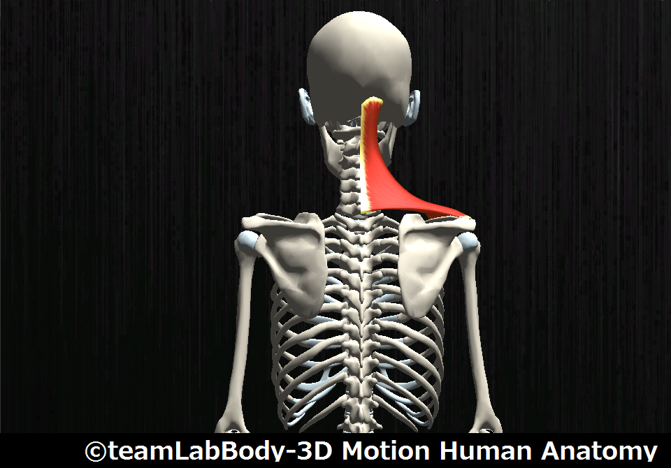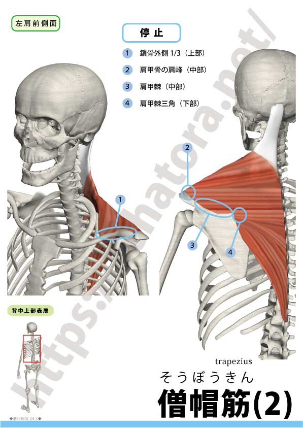 | 起始 | ①上部線維:後頭骨上項線・外後頭隆起・項靭帯 ②中部線維:C7–T3棘突起 ③下部線維:T4–T12棘突起 |