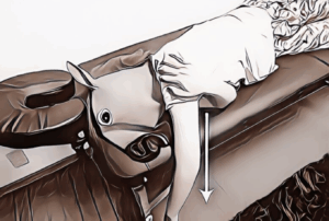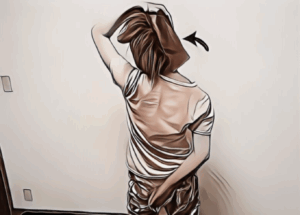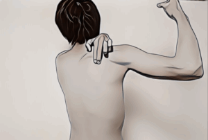 ストレッチ:患側上肢を内転位、反対手で頸椎を屈曲+患側と反対方向へ側屈・回旋。