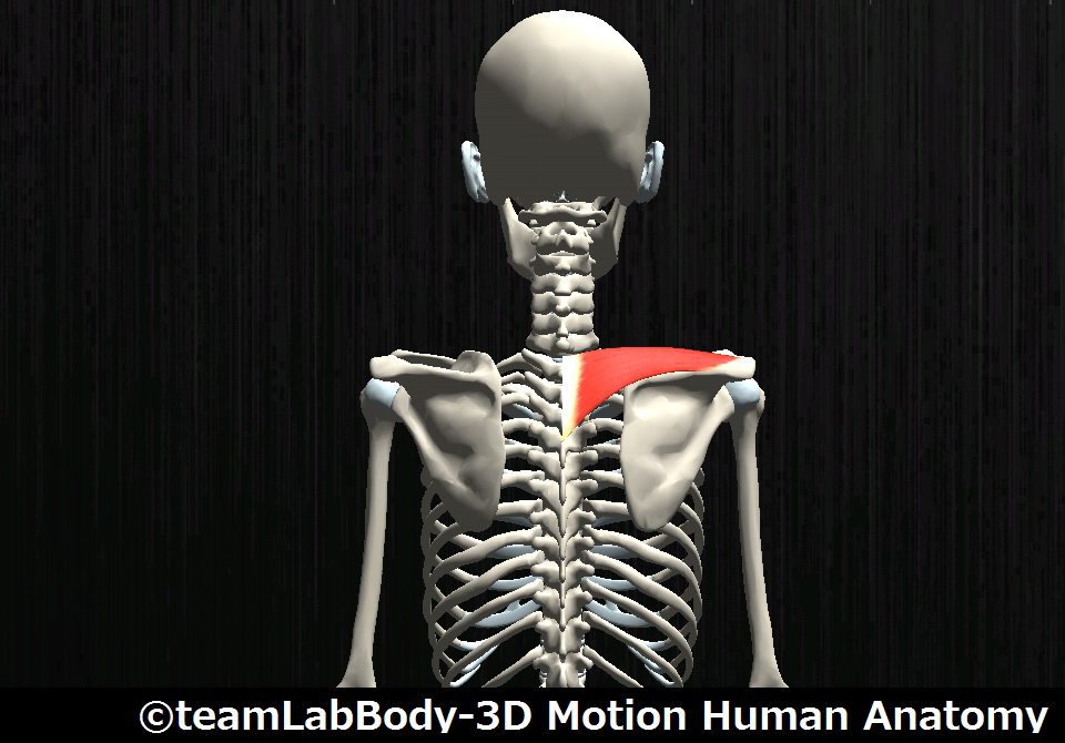 触診:肩関節水平伸展に抵抗を加えると中部が浮き上がる。
