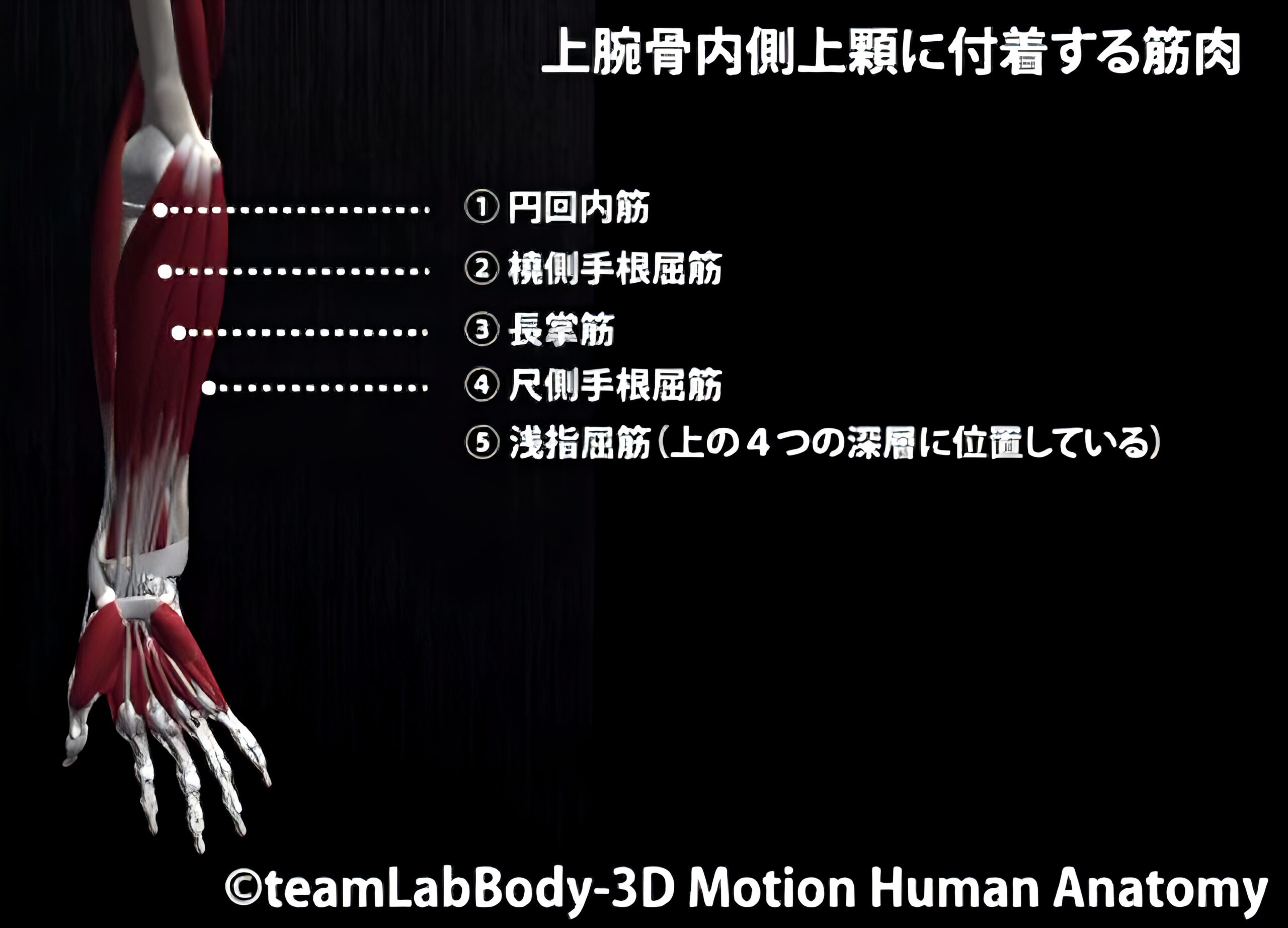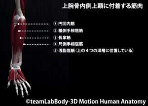 円回内筋・橈側手根屈筋・長掌筋・尺側手根屈筋・浅指屈筋。