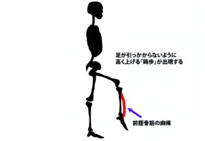 主訴:足背〜母趾基部の鋭い痛み、スネ前面の張り・だるさ、歩行時のつま先が上がりにくい感じ。