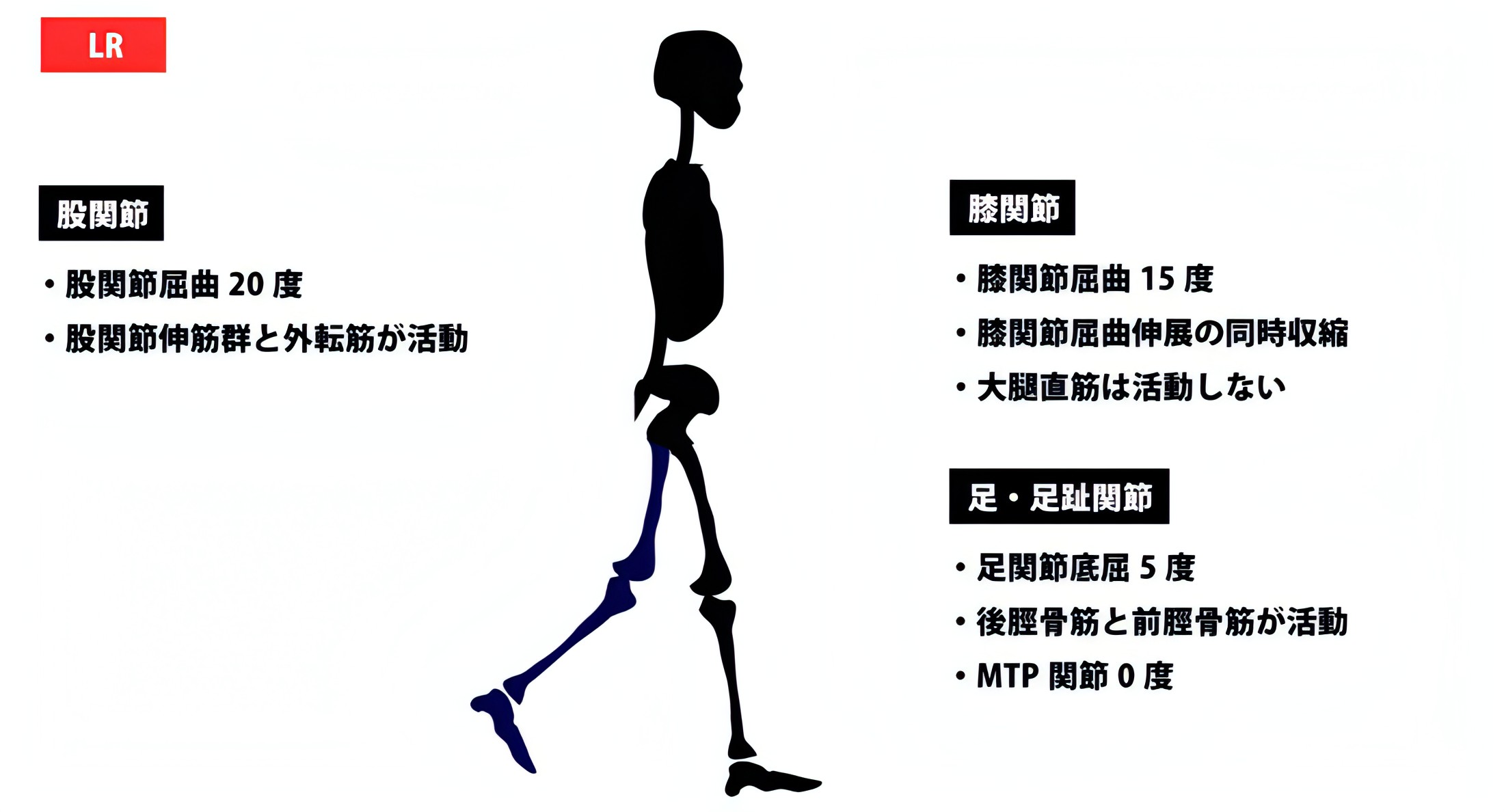 PSw/ISwでは求心性に背屈してつま先の引っ掛かりを防止、LRでは遠心性に底屈を制動して接地衝撃を吸収します。