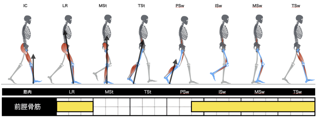 前脛骨筋は前遊脚期(PSw)後半〜荷重応答期(LR)まで長く活動
