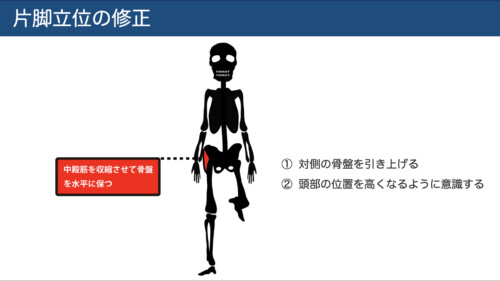 具体的な方法としては、片脚時に立脚側の骨盤を押し下げると同時に対側の骨盤を引き上げ、背骨を伸ばすように意識させます。
