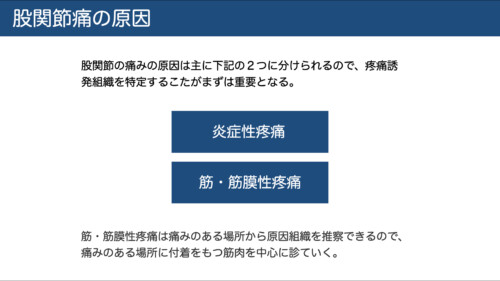 股関節痛の原因は「炎症」または「筋・筋膜の滑走不全(攣縮や癒着)」のため、まずは疼痛誘発組織の特定が重要です。