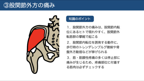 股関節側方の痛みは、歩行時にトレンデレンブルグ徴候や骨盤側方動揺があるヒトで現れやすいです。