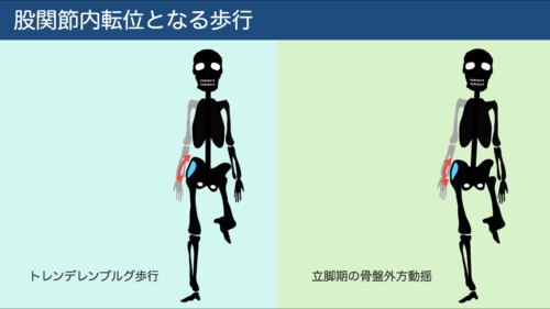 歩行時に股関節が内転位になると、中殿筋や小殿筋といった外転筋群の収縮することで支えるため、結果的に攣縮を引き起こす原因となります。