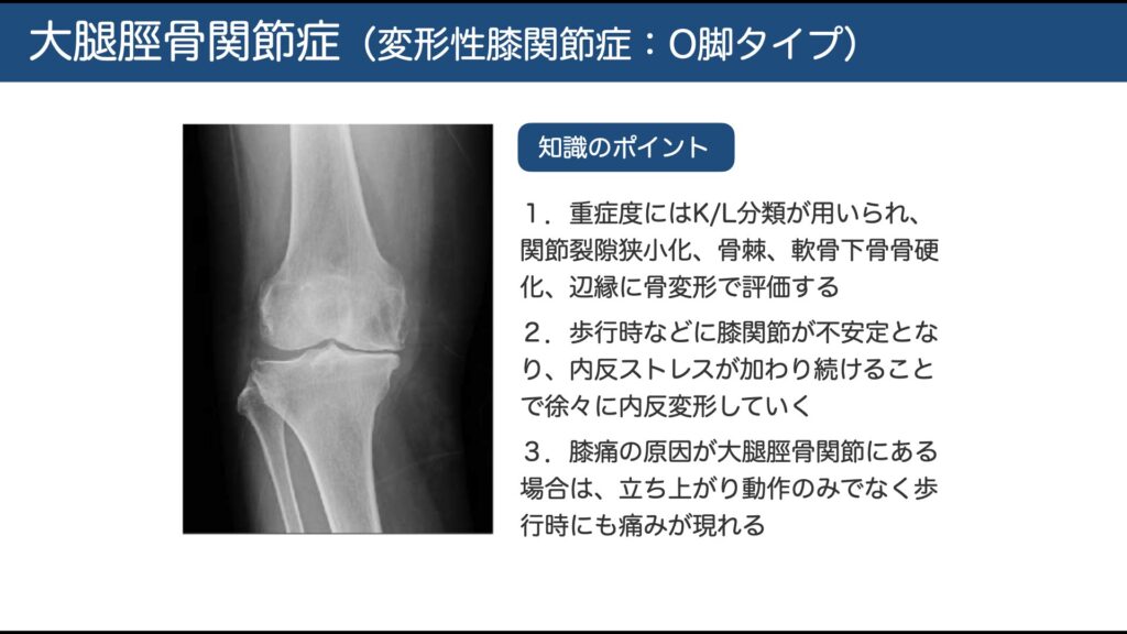 部位:大半は大腿脛骨関節(FT)内側が主座(O脚=内反変形が進行)。