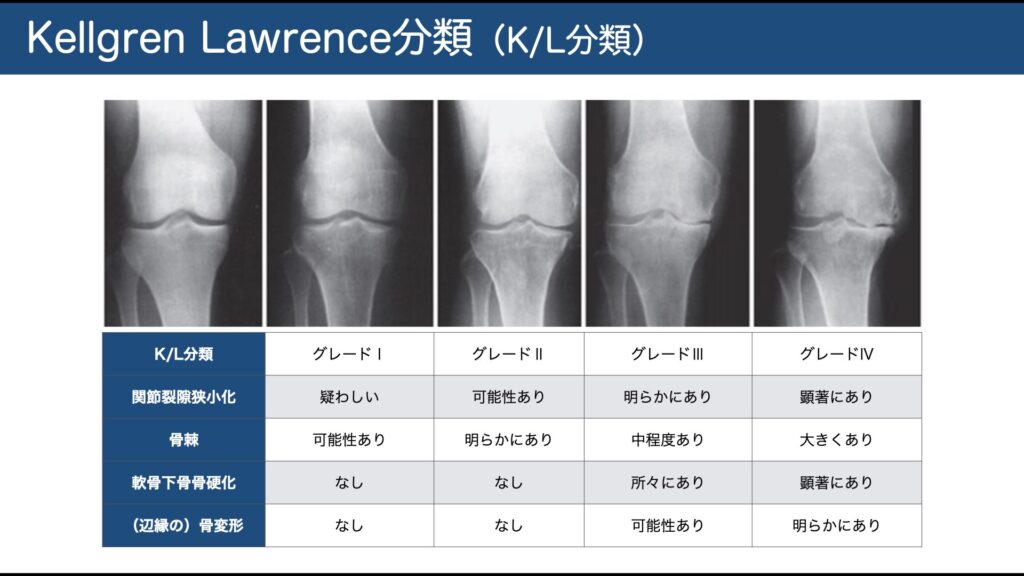 X線:関節裂隙狭小化、骨棘、骨硬化、アライメント(K/L分類の目安に)。