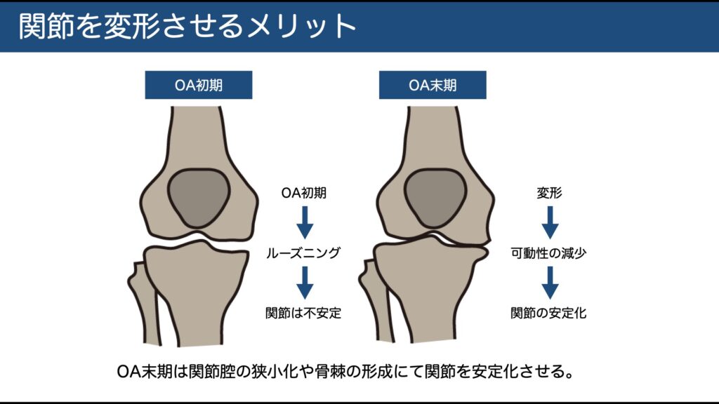 進行の力学:歩行時(立脚前半相)の過大な外反モーメントが内側荷重を増やし、内側の軟骨・半月板の代謝不全→変性を促進。