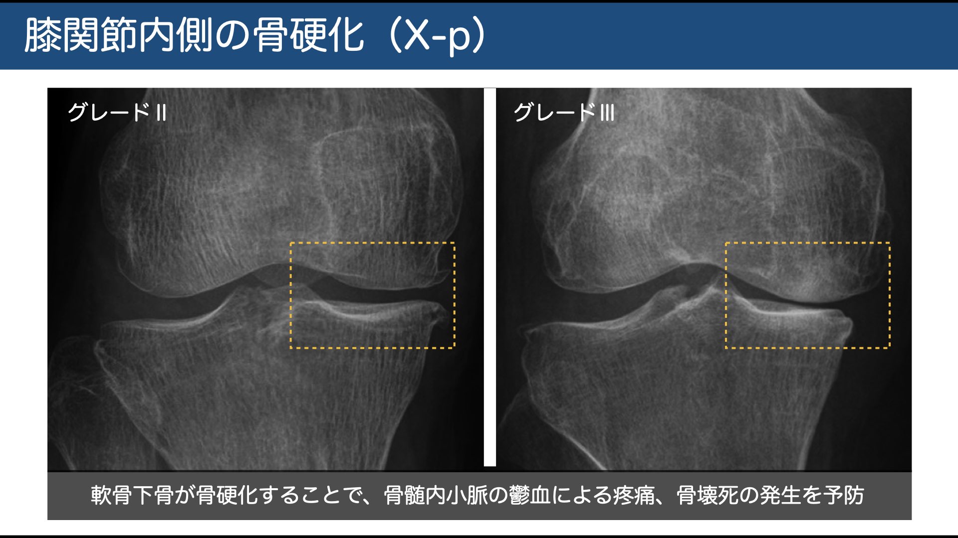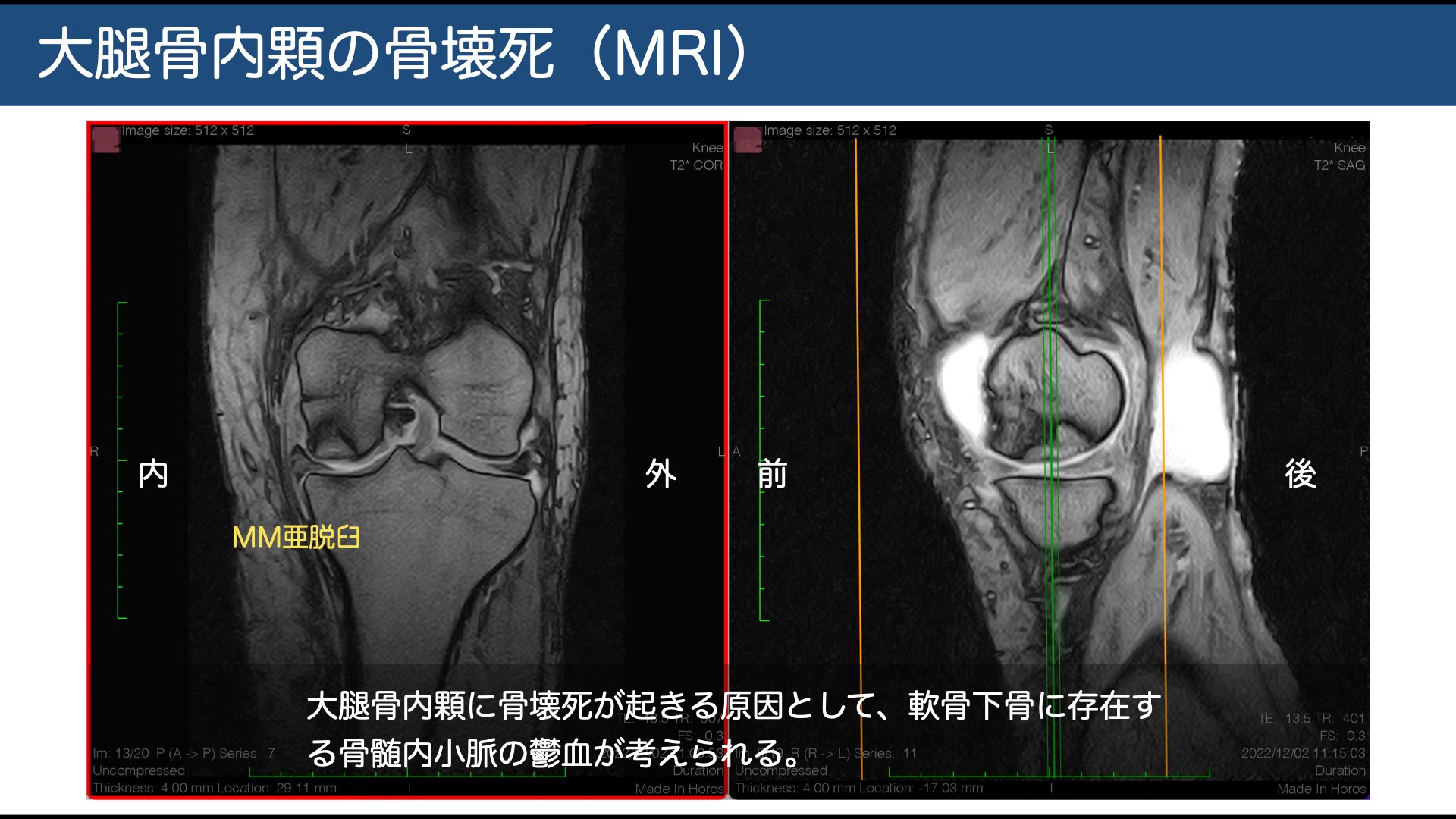 組織学的推論:歩行痛→FT(滑膜・半月板)、**立ち上がり痛→PF(脂肪体)**の可能性が高い。