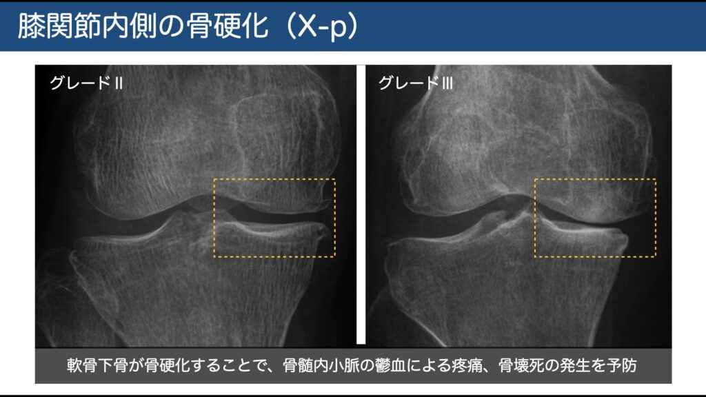 軟骨・軟骨下骨には痛覚がほぼない。主に痛むのは滑膜・関節包・脂肪体・半月板周囲などの軟部組織。