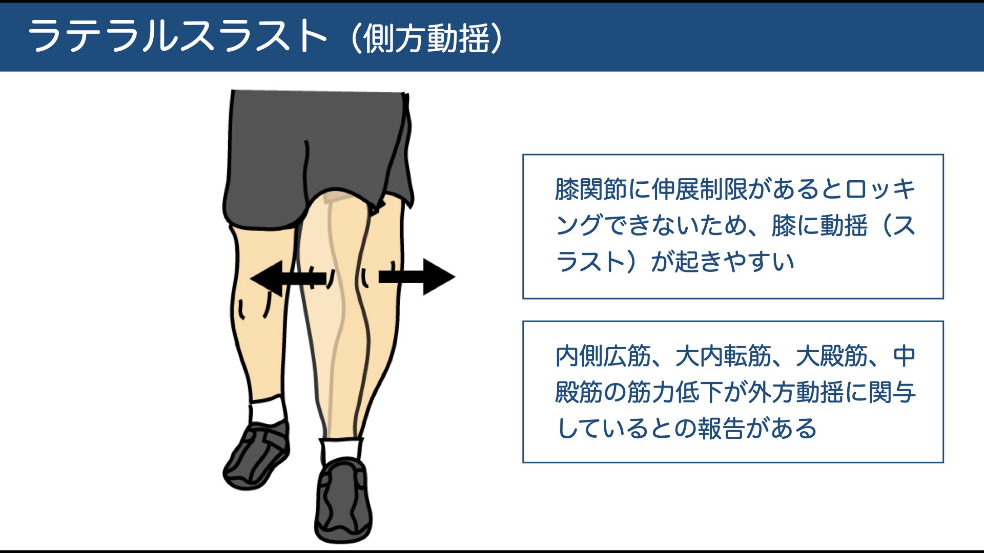 原因例:①膝内反位荷重(ラテラルスラスト) ②骨盤外方位 ③COM外方位 ④COP外方位。