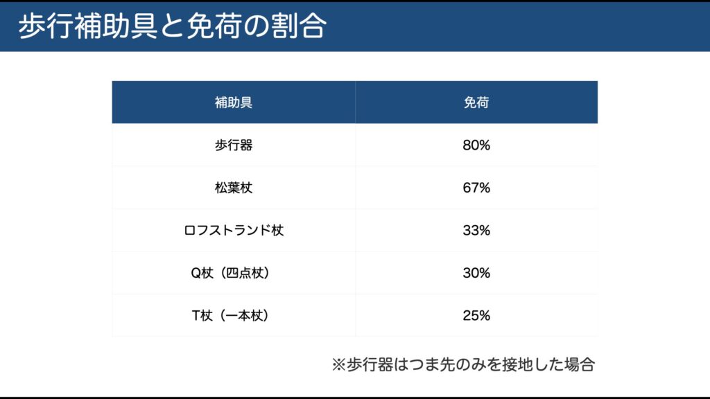 歩行器≈80%|松葉杖≈67%|四点杖≈30%|T杖≈25%