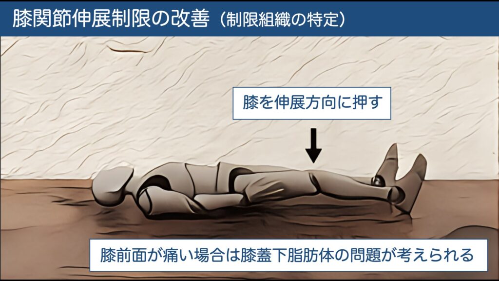 A. 膝蓋下脂肪体関与が示唆。脂肪体の滑走改善と膝蓋骨モビライゼーションを優先します。