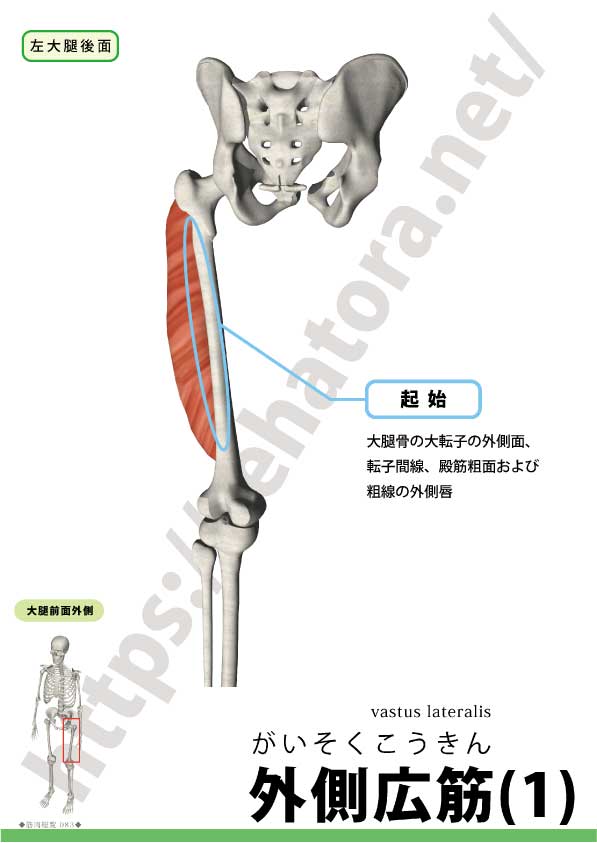 膝関節伸展の主力で、膝蓋骨を外上方へ牽引する線維配列を持つ(外側膝蓋支帯と連結)。