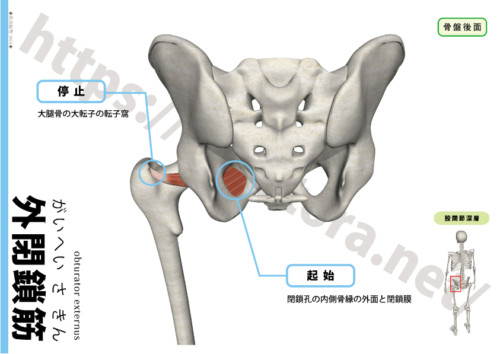 外閉鎖筋は股関節の深層外旋六筋のうち最も前面・深層にある筋。閉鎖膜の外面と周囲骨から起こり、大腿骨大転子の転子窩へ向かう。骨盤内から坐骨孔を通って出る内閉鎖筋と異なり、小坐骨孔は通過しない。主作用は股関節外旋で、軽い内転補助と**大腿骨頭の求心化(関節安定化)**にも寄与する。