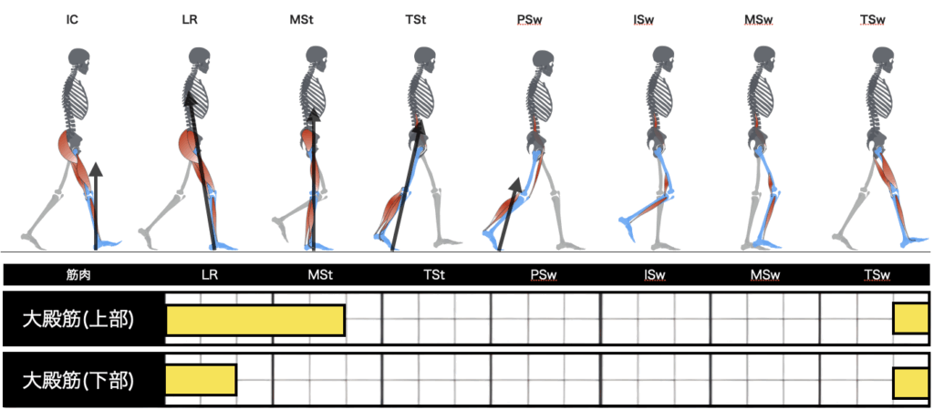 大殿筋は遊脚終期(TSw)の後期から荷重応答期(LR)にかけて遠心性収縮に働くことが特徴です。