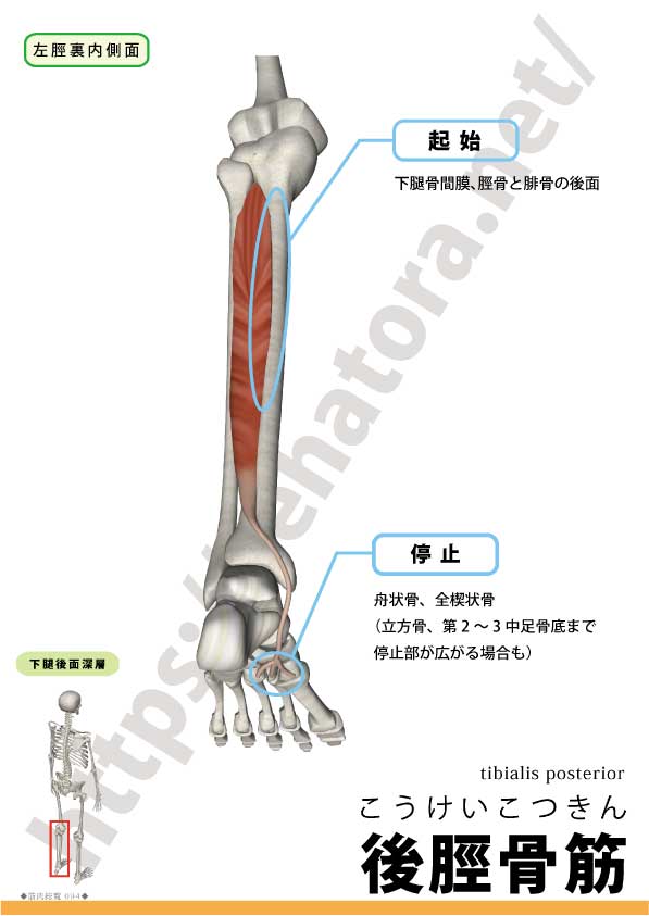 役割は足関節の内反(距腿関節の底屈+距骨下関節の内転の複合)と、内側縦アーチの保持。