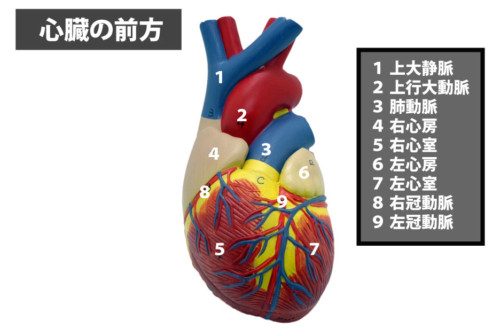 血液の流れ:①大静脈→②右心房→③右心室→④肺動脈→⑤肺→⑥肺静脈→⑦左心房→⑧左心室→⑨大動脈。
