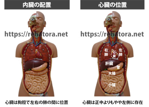 心臓はやや左寄りに位置し、交感神経の節髄レベル(T1–T4/5)と横隔神経(C3–5)由来の知覚が体性神経の皮膚知覚と“混線”しやすい(内臓‐体性反射)。