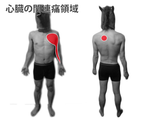 関連痛:左胸〜左肩・上腕〜前腕内側、背面は左上背部に出やすい。