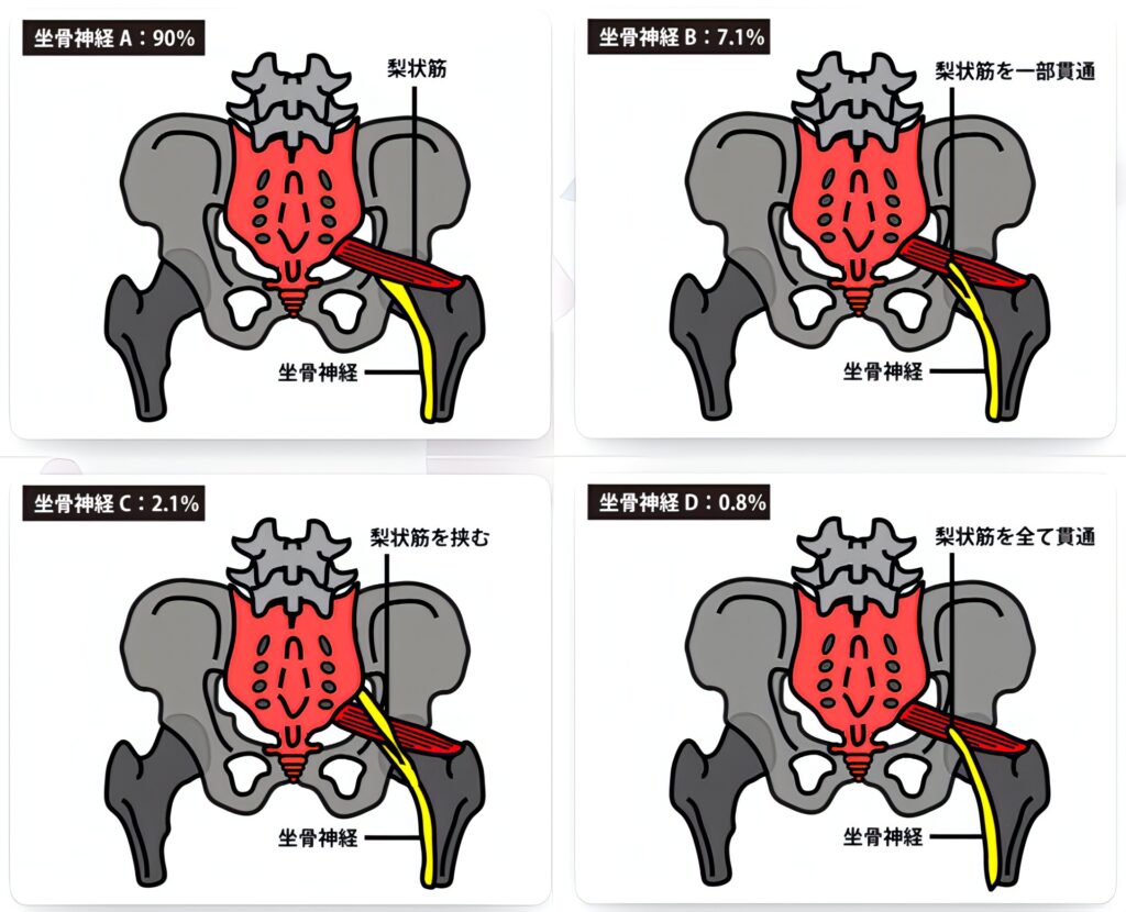 • 坐骨神経の走路には解剖バリエーションあり:多くは梨状筋の下(タイプA)、まれに貫通(タイプB/Dなど)。貫通型は圧迫を受けやすい。