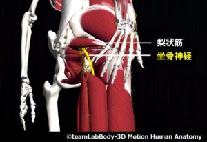 • 特徴:すぐ下(前下方)を坐骨神経が走るため、筋のこわばりや肥厚で神経を圧迫すると梨状筋症候群(殿部〜下肢後面の痛み・しびれ)を起こしやすい。