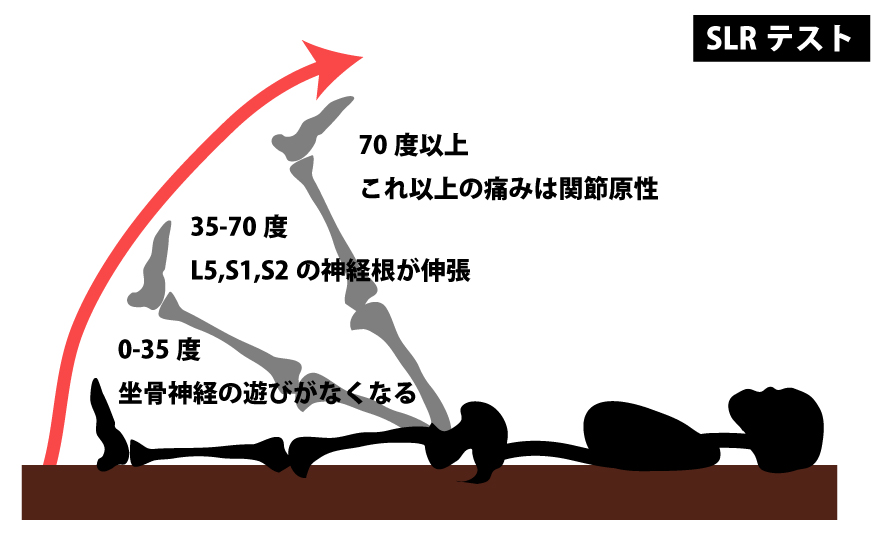 SLR(Straight leg raise)は、別名「下肢挙上テスト」とも呼ばれます。坐骨神経(L5-S2)とその硬膜を末梢側に伸張します。
