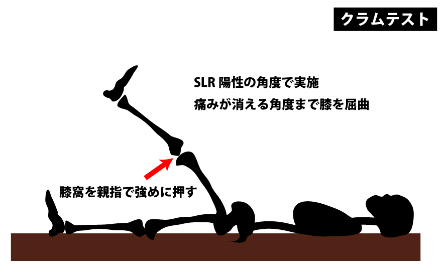 SLRテストで陽性となった角度から約5度降ろし、検査者は下肢を内旋、内転させます。下肢後面の電撃痛が再現されたら陽性とします。