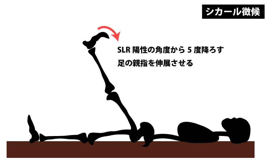 SLRテストで陽性となった角度から約5度降ろし、検査者は足の親指を伸展させます。下肢後面の電撃痛が再現されたら陽性とします。