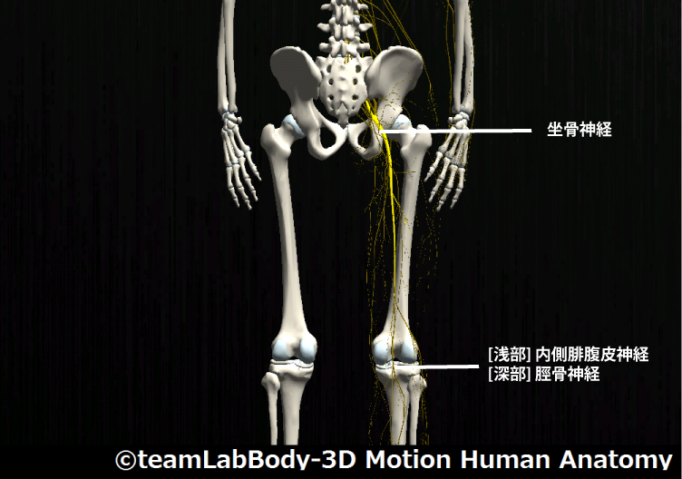 膝窩部には坐骨神経から分岐している内側腓腹皮神経と脛骨神経が通過しているため、それらを圧迫することで坐骨神経を伸張することが可能となります。