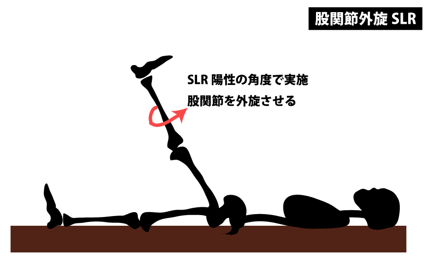 SLRテストで陽性となった角度から、検査者は股関節を外旋させます。下肢後面の電撃痛が再現されたら陽性とします。