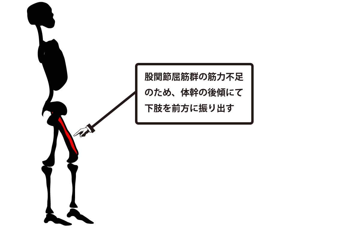 股関節屈筋群の筋力不足の場合は、遊脚期に体幹を後傾させることで代償的に下肢を振り出します。