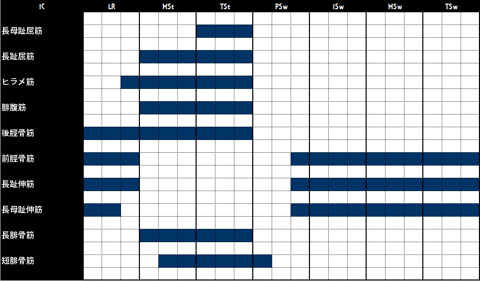 足部の自由落下により、各関節で大きな回転モーメントが発生しますが、その衝撃を吸収するために膝関節や足関節に大きな筋収縮が要求されます。
